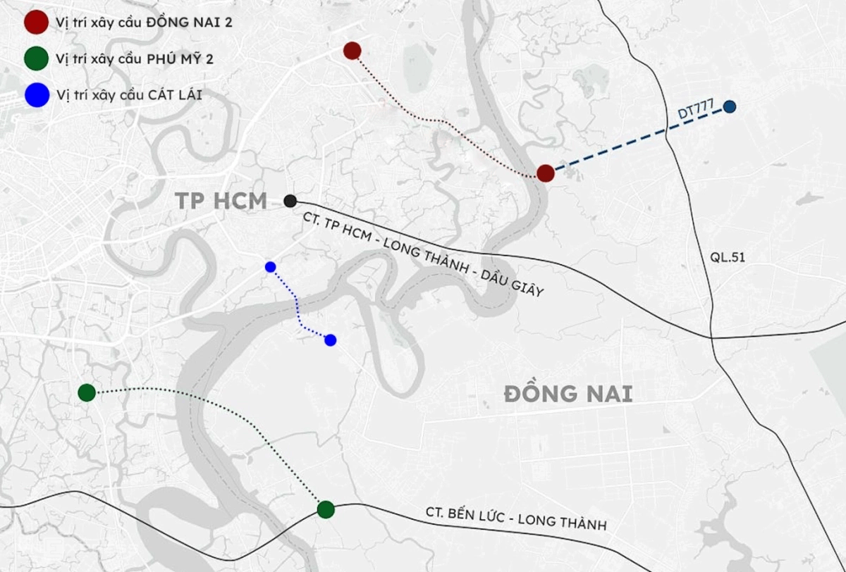 Ngoài cầu Long Hưng, sông Đồng Nai đồng loạt động thổ cầu Cát Lái và cầu Phú Mỹ 2 nối tỉnh này với TP HCM. Dự kiến ba cây cầu đưa vào hoạt động năm 2028.