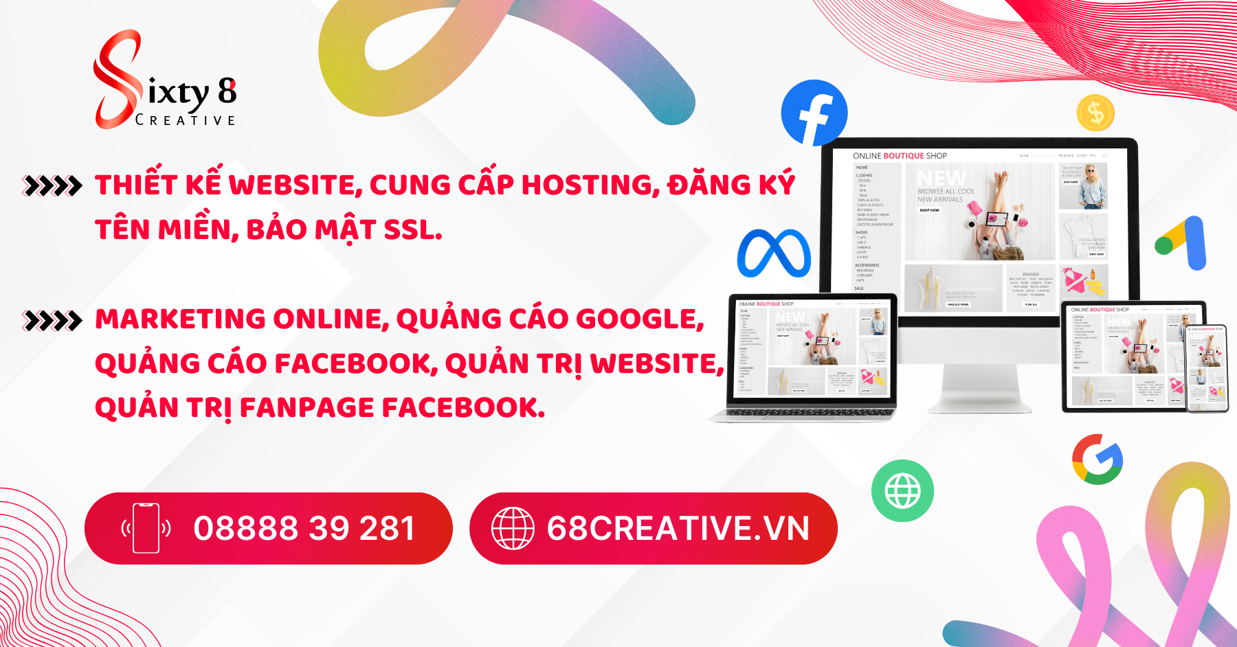 68 CREATIVE là một công ty chuyên công nghệ thông tin chuyên Thiết kế website và Marketing online. Cung cấp giải pháp toàn diện cho doanh nghiệp tiếp cận hàng triệu khách hàng tiềm năng.